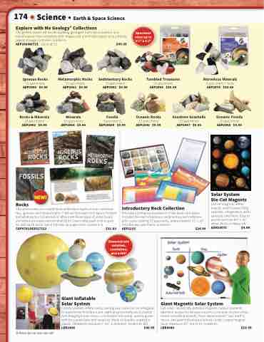 Colorful planets inflate easily, turning any room into an intergalac- tic experience! Includes a sun, eight proportionally sized planets with hanging hooks, moon, convenient foot pump, activity guide with fun planet facts and repair kit. Made of durable, washable plastic. Inflatables measure 5"-23" in diameter. Grades K+ 1 LER2434 $49.99