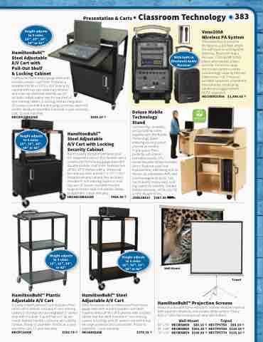 Built to easily transport and keep your A/V equipment secure, this durable cart is constructed from heavy gauge steel with durable powder coat finish. Features two 24"W x 18"D shelves with a ribbed rub- ber mat top shelf, and 231⁄2" x 171⁄2" x 151⁄2" lockable security cabinet (key included). Includes 4" non-marring casters (2 lock- ing) and 16' power cord with 4-outlet surge protector and cord winder. Ready to assemble. 1-year warranty. HECHACAB4226E $464.85 ≠