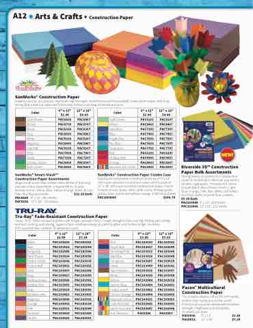 12" x 18" 100-count assorted construction paper. Colors include: brown, black, white, pink, violet, holiday green, yellow, blue, scarlet and yellow-orange. 2,000 total sheets.