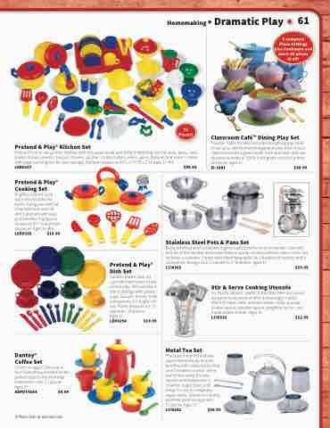 Durable plastic dish set can withstand years of pre- school play. Set includes 4 place settings with plates, cups, saucers, knives, forks and spoons in 4 bright col- ors. Plates measure 51⁄4" in diameter. 24 pieces.